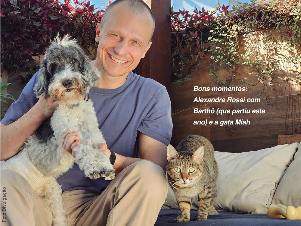 Álbum de família: Alexandre Rossi com Barthô e a finada Estopinha, a pet influencer que deixou saudades em milhões de seguidores.